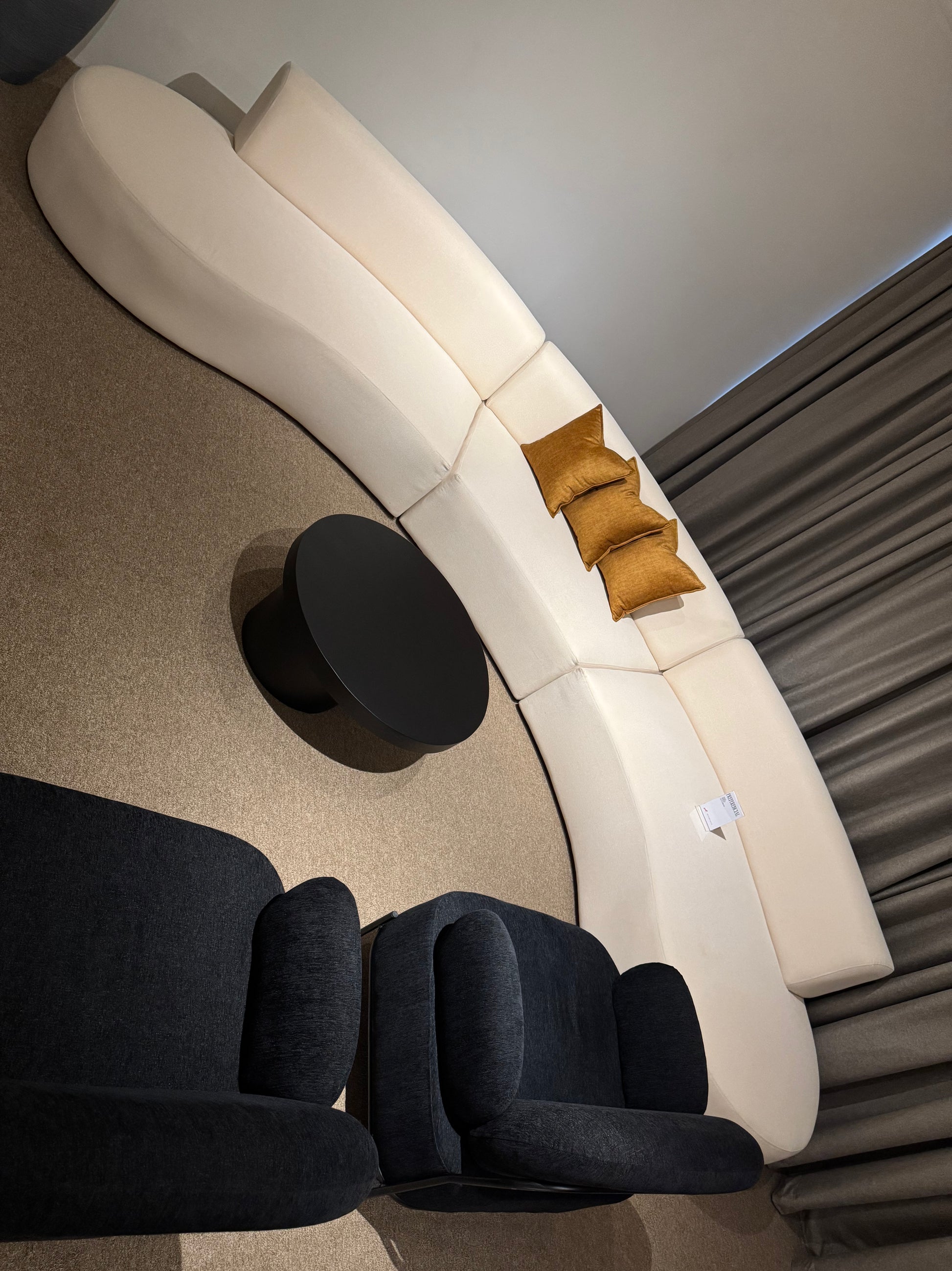 Tapizado en lino baby beige, este sofá cabalga entre el diseño y la sofisticación.