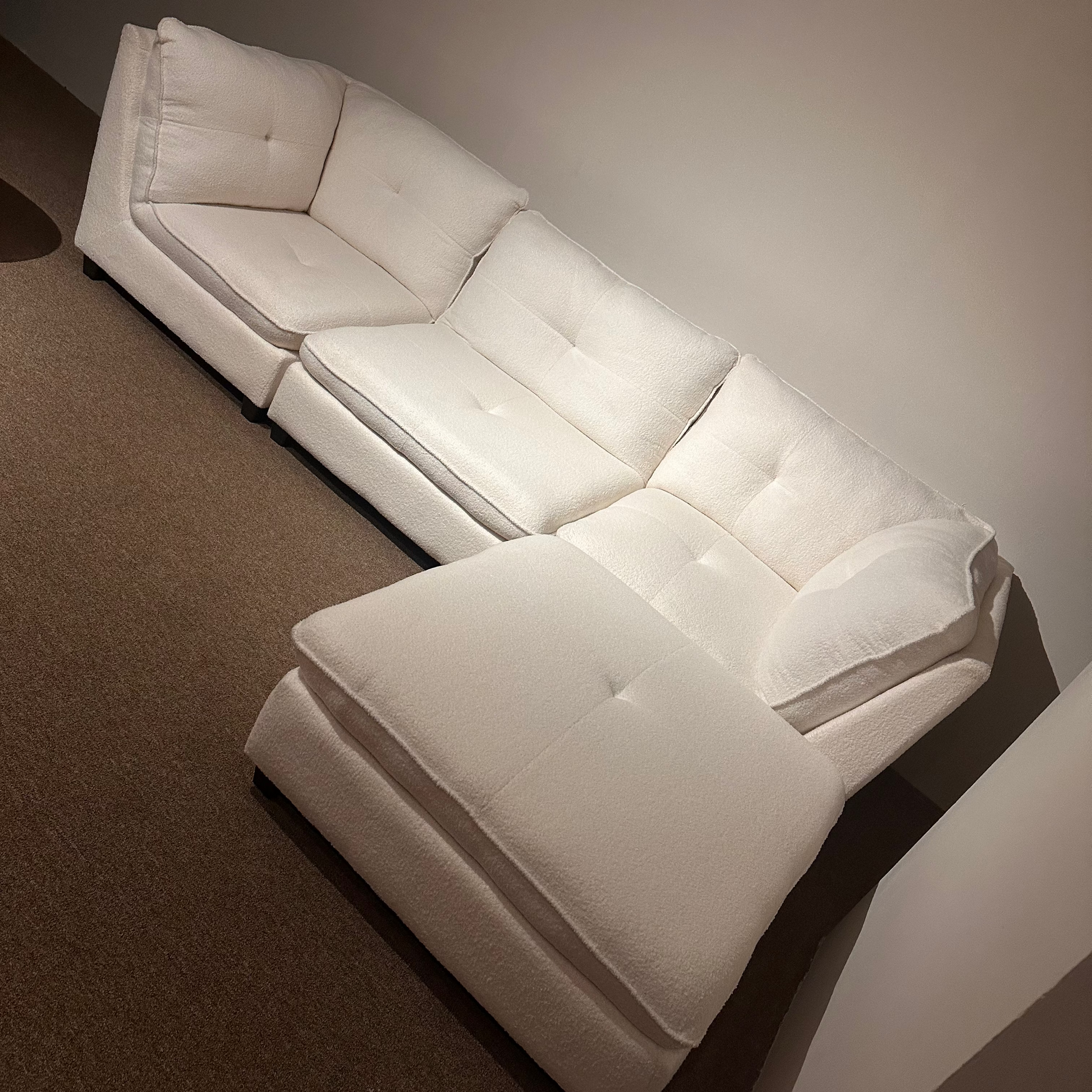 Tapizado en bouclé importado y diseñado con un sistema modular versátil, su confort súper suave invita a quedarse, desconectar y simplemente sentir.